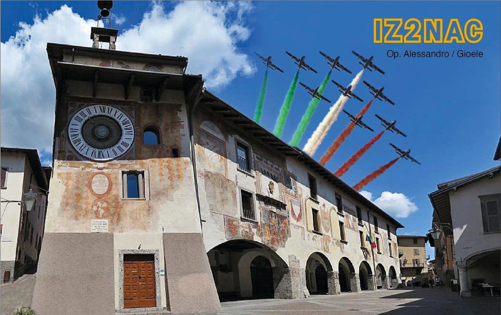 My QSL card represents the Fanzago clock of Clusone, famous all over the world for the simple fact that the lancett turn counter-clockwise and because it's very precise and besides marking the time it also shows in what year we are, the month in which we are and also the moon phase that there is at this exact moment!